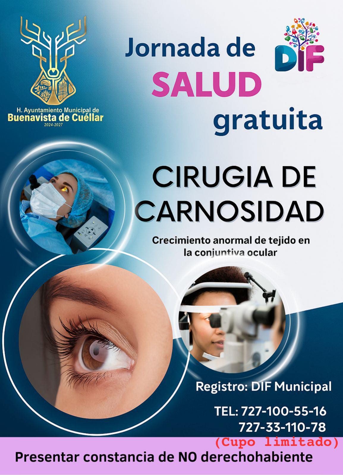 Jornada de Salud Gratuita El H. Ayuntamiento Municipal de Buenavista de Cuéllar 2024-2027 en coordinación con el DIF Municipal, invita a todas las personas a participar en la Campaña de Cirugía de Carnosidad . La carnosidad es un crecimiento anormal de tejido en la conjuntiva ocular que puede afectar tu visión. ¡Aprovecha esta oportunidad para […]